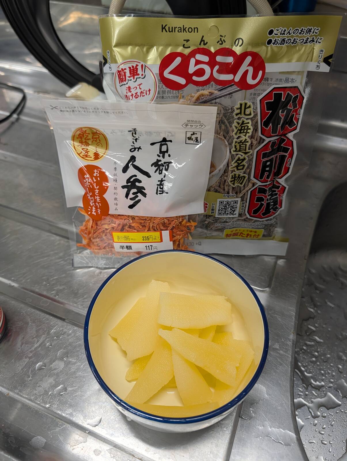 - 良い感じで松前漬けが仕上がったが、普通の水で塩抜きしたので数の子に苦みが出てた。